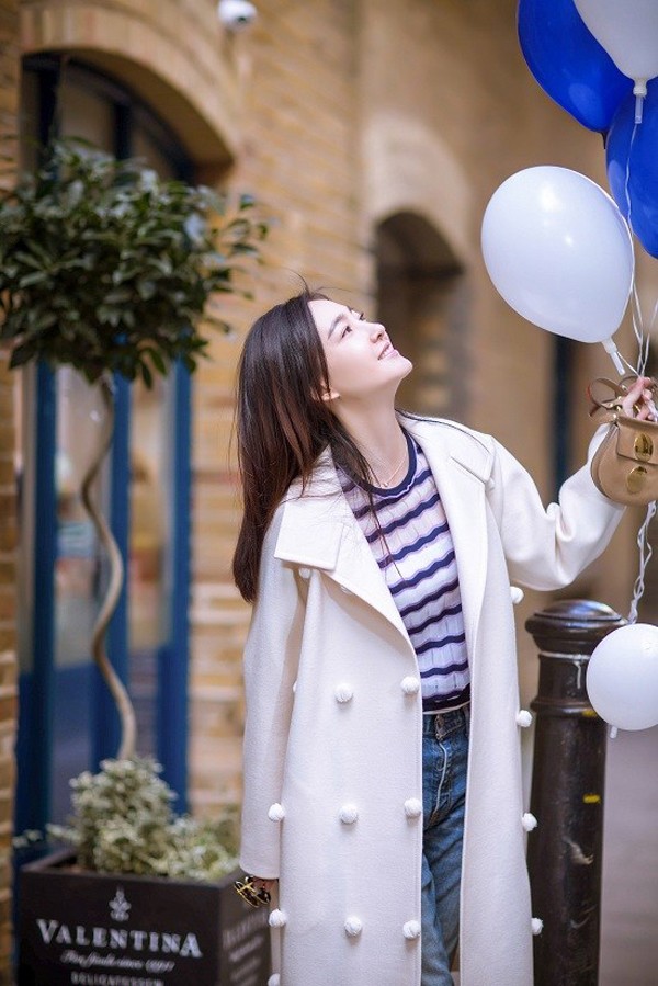 尤为引人注目的是,王丽坤手中轻轻牵着的几只蓝色与白色气球。这些跳跃的气球仿佛被注入了灵魂,成为整组写真的点睛之笔。它们打破了古老街道的沉静,为王丽坤的周身增添了一抹灵动俏皮的色彩。当她手持气球,或伫立凝望,或翩然行走时,仿佛一位从童话故事中走出的女孩,美好韶光就在她轻盈的脚步与飞扬的裙摆间悄然定格。这巧妙的一笔,将青春的活力与老街的历史光影完美地串联起来,动静结合,意境悠远。