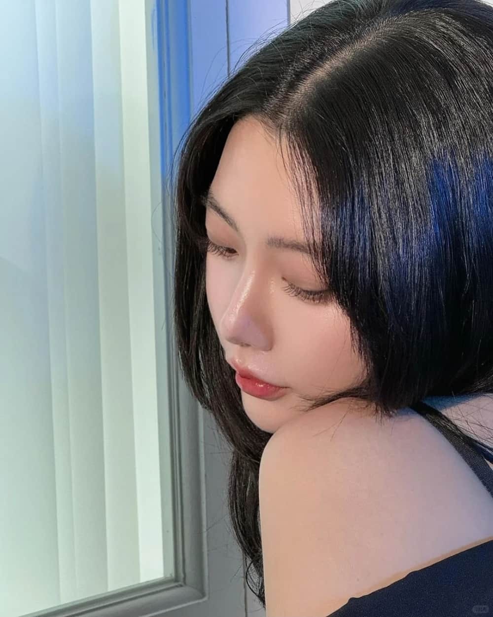 克拉拉身穿黑色蕾丝吊带裙倚靠窗边,窗外光影洒落,与她慵懒而神秘的气质交织,充满电影画面感。