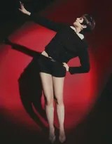 卡莉以一袭黑色优雅长裙侧身而立,光影勾勒出精致轮廓,复古发型与红唇诉说经典韵味