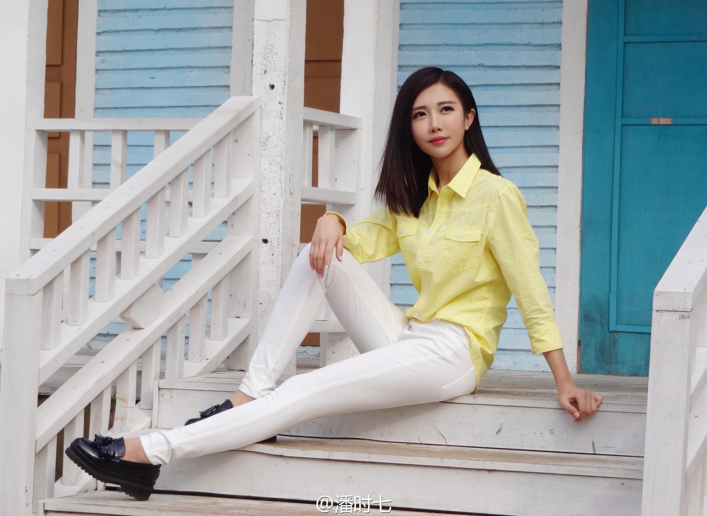 在这组被标注为“生活照”的写真中,我们可以看到潘时七尝试了多种风格。部分照片中,她以简约的装扮出镜,高跟凉鞋搭配修身短裙,展现修长腿部线条,整体造型清新自然,散发着随性而优雅的生活气息。这种“裸腿”与高跟的搭配,恰恰凸显了其身材比例的优越和驾驭简约时尚的自信。
