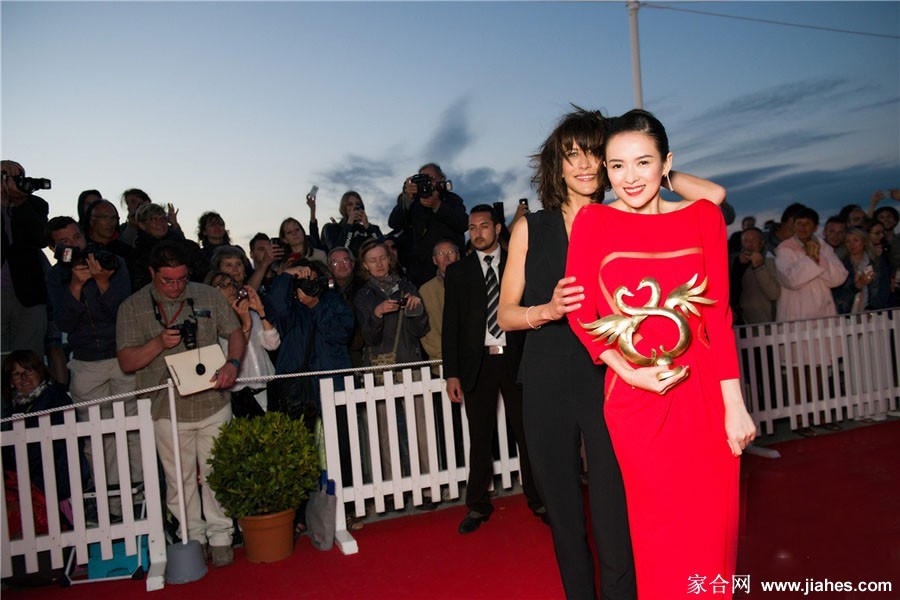 章子怡一袭Elie Saab正红长裙,宛如烈焰玫瑰绽放于卡布尔红毯之上章子怡与苏菲玛索在颁奖台上深情拥抱,东方典雅与法兰西浪漫完美融合章子怡手捧金色天鹅奖杯优雅微笑,身后是见证荣耀的璀璨舞台闭幕式后章子怡手持奖杯侧身而立,红色裙摆摇曳生姿,尽显荣耀时刻的从容